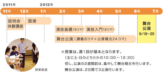 | 講座内容 | A:「演劇講座」(24コマ) 【演技基礎(8コマ)+演技入門(8コマ)+高井ワークショップ(8コマ)】 B:「舞台公演講座」(26コマ+舞台公演) 【高井ワークショップ2コマ+稽古(24コマ)+舞台公演本番2日間】 |